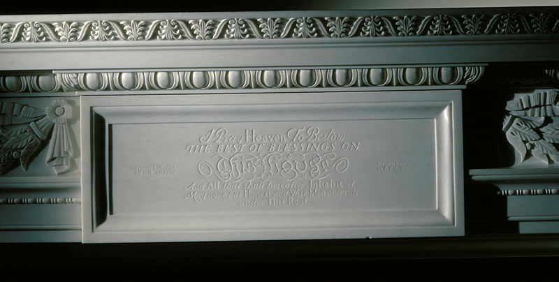 This photograph is of John Adams' blessing, which is engraved in the mantel in the State Dining Room. The benediction reads, “I Pray Heaven To Bestow The Best Of Blessings On This House And All that shall hereafter Inhabit it. May none but Honest and Wise Men ever rule under This Roof.” The words are taken from a letter written to Abigail Adams from the President's House by Adams in 1800 and were engraved on the mantel in 1945 during the administration of Franklin D. Roosevelt.