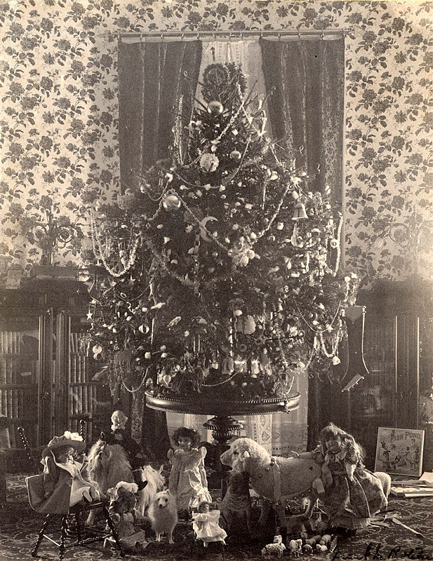 This is a silver gelatin print of a Christmas tree in the Yellow Oval Room by Frank Boteler, ca. 1896. This is one of the earliest known images of a White House Christmas tree, it is also one of the first photographs of an electrically illuminated Christmas tree. The small, but spectacularly decorated tree is surrounded by toys for the children.