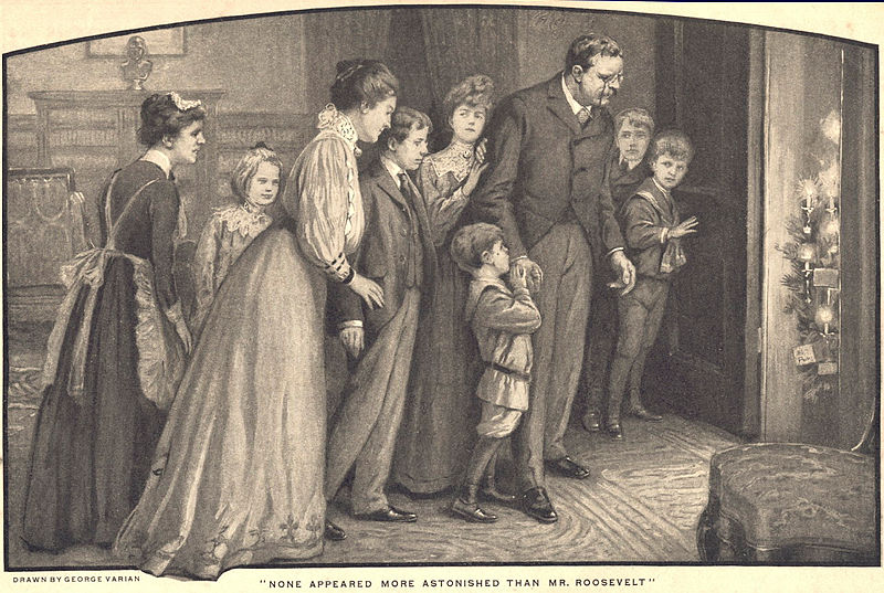 This drawing by George Varian shows the Roosevelt family admiring a Christmas tree. The caption reads: "None appeared more astonished than Mr. Roosevelt."
