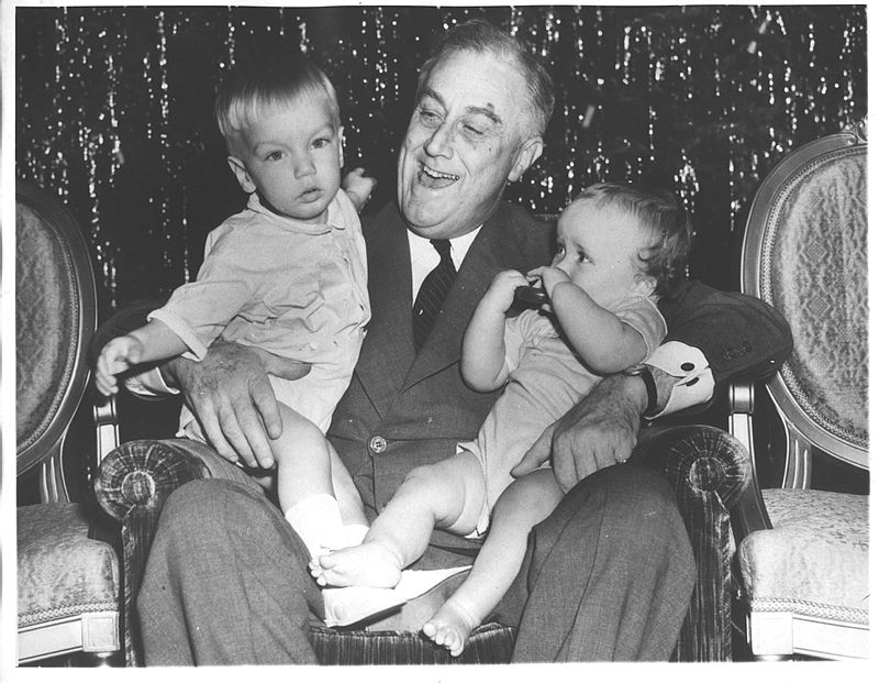This black and white photograph is of President Roosevelt celebrating Christmas in the White House with his grandchildren Franklin D. Roosevelt III (left) and John R. Boettiger (right).