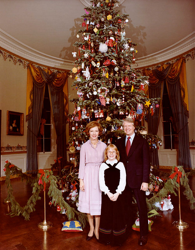 This photograph of President Jimmy Carter, First Lady Rosalynn Carter, and their daughter Amy posing in front of the Blue Room Christmas tree was taken by Karl Schumacher in December 1977. The decorations that year celebrated a classic American Christmas and featured handmade craft ornaments. Mrs. Carter, a mental health reform activist, invited an organization for handicapped Americans to create the more than 2,000 ornaments that eventually adorned the tree. The volunteers used local materials, such as pine cones from Colorado and nut pods from Hawaii, to make the ornaments.