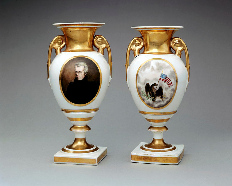 Both of these vases were produced by either William Ellis Tucker or Joseph Hemphill, both of Tucker and Hemphill in Philadelphia. This firm was the most significant porcelain factory of early 19th century America. The vase on the left depicts President Andrew Jackson and has patriotic motifs on the reverse. The vase on the right is the reverse view and has a portrait of the Marquis de Lafayette on the front. The vases were added to the White House Collection through the White House Acquisition Fund in 1979.