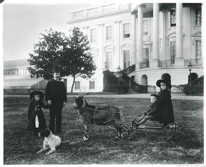This is a photograph of Benjamin Harrison McKee, affectionately nicknamed "Baby McKee" by the press, holding the reigns of "His Whiskers," a goat presented to him by his grandfather President Benjamin Harrison. Also pictured from left to right are his uncle, Russell Harrison, son of the president, Russell's daughter Marthena Harrison, the dog Jack, and sister Mary Lodge McKee. Mary Scott Harrison McKee, "Baby McKee" and Mary's mother, took over as White House hostess upon the death of her mother, First Lady Caroline Lavinia Scott Harrison in 1892.