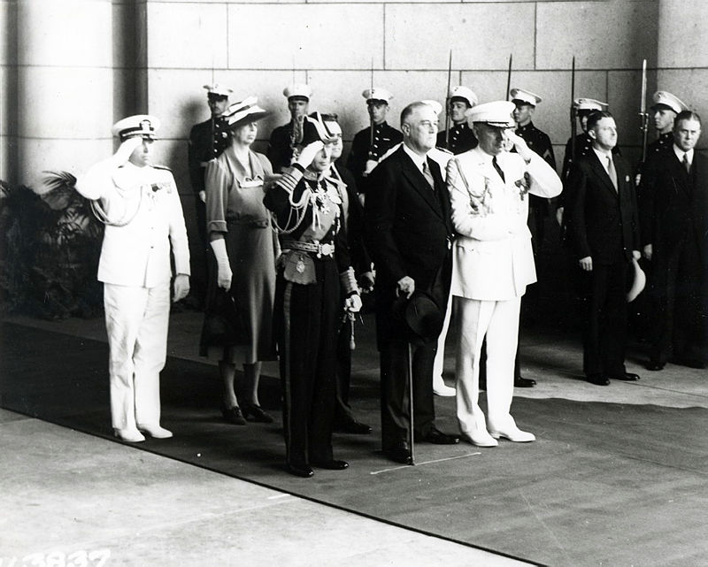 In this black and white photograph, President Franklin D. Roosevelt welcomes King George VI of Great Britain at Union Station in Washington, D.C. The British monarch stands on the left of the photo, saluting, with the president in the middle being supported by his aide, Brig. Gen. Watson. First Lady Eleanor Roosevelt stands in a line behind the men flanked by additional military aides. Queen Elizabeth is also in line but not visible behind Watson. This was the first time a reigning British monarch had visited the United States.