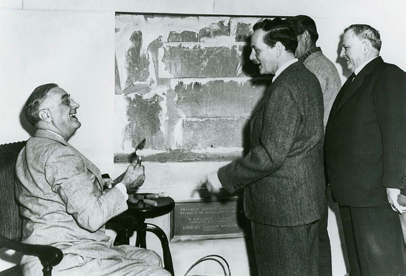 In this black and white photograph, President Roosevelt lays the cornerstone for the new East Wing. The original East Wing, used mostly as an entrance, was built in 1902 during President Teddy Roosevelt’s administration. In 1942, the East Wing was expanded to include a second floor, more office space, and the Presidential Emergency Operations Center.