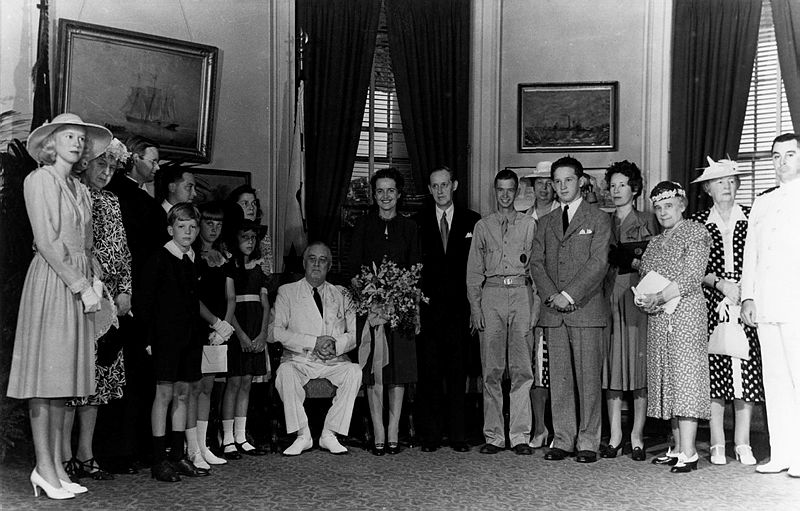 This black and white photograph shows the wedding of Louise Macy and Harry Hopkins in the Yellow Oval Room of the White House. President Franklin D. Roosevelt is seen seated next to the bride holding her bouquet, and First Lady Eleanor Roosevelt is standing behind a few of the wedding guests. Harry Hopkins was a close friend of President Roosevelt, who helped administer the President’s New Deal federal work programs and later became the Secretary of Commerce.