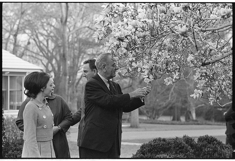 In this photograph, taken by Yoichi R. Okamoto on March 27, 1968, President Lyndon B. Johnson plucks a flower from a blossoming saucer magnolia tree in the Rose Garden as a gift for Olympic figure skater Peggy Fleming. The 19-year-old figure skater earned a gold medal in the ladies' singles competition at the 1968 Winter Olympic Games in Grenoble, France. President Johnson invited Fleming and her mother Doris to the Oval Office, where he presented the Olympic champion with a gold bangle and pinned the magnolia blossom to her lapel. Later in her career, Fleming headed a figure skating group that performed for President Jimmy Carter during a Christmas party for White House staff on December 22, 1980.