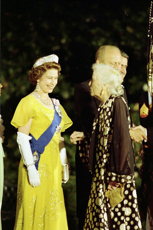 In this photograph by Ricardo Thomas, Queen Elizabeth II of Great Britain welcomes Alice Roosevelt Longworth in a receiving line on the on July 7, 1976. Behind Longworth is President Gerald R. Ford. The receiving line, which took place on the South Drive of the White House, was held prior to a State Dinner in honor of Queen Elizabeth. The State Dinner was held under a tent in the Rose Garden on the South Grounds of the White House and followed a State Arrival Ceremony held earlier in the day. Queen Elizabeth, along with her husband, Prince Philip, the Duke of Edinburgh, visited the United States from July 6 to 11 in celebration of the American Bicentennial.