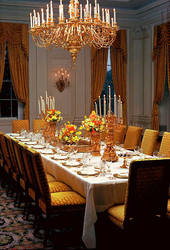 This photograph of the State Dining Room was taken by National Geographic around 1962, during the John F. Kennedy administration. On the long table rests James Monroe's 13-foot gilded bronze surtout de table centerpiece or plateau that is the oldest object still used in the State Dining Room.